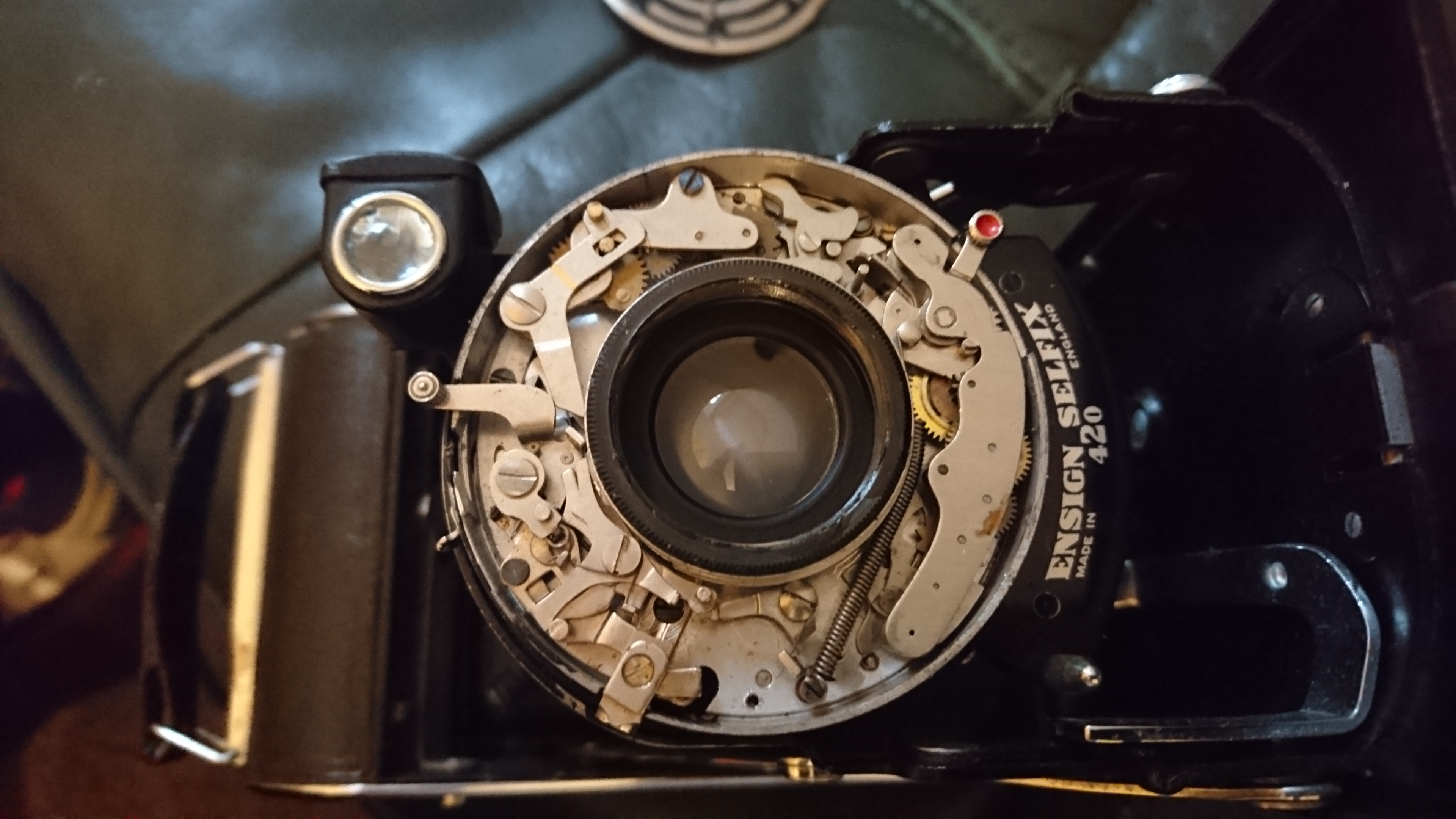 One of the trickiest problems was how to connect the Pi Zero to the original shutter release mechanism. Due to the beautiful folding bellows, the mechanical button on top actually pushes a series of pivoting levers which then push the shutter release lever mounted on the lens ring. To avoid interfering with the folding bellows and to keep the original aesthetics I couldn't put wires on the outside. I was (and still to be honest) thinking of running wires on the inside of the bellows to the actual clockwork shutter release mechanism. I even bought a second Ensign Selfix 420 on eBay so that I could safely dismantle the clockwork mechanism without fear of ruining the working camera. Unfortunately, even though the clockwork mechanism is beautiful, it was just too fiddly to fit a microswitch inside. Especially with the iris shutters getting in the way.