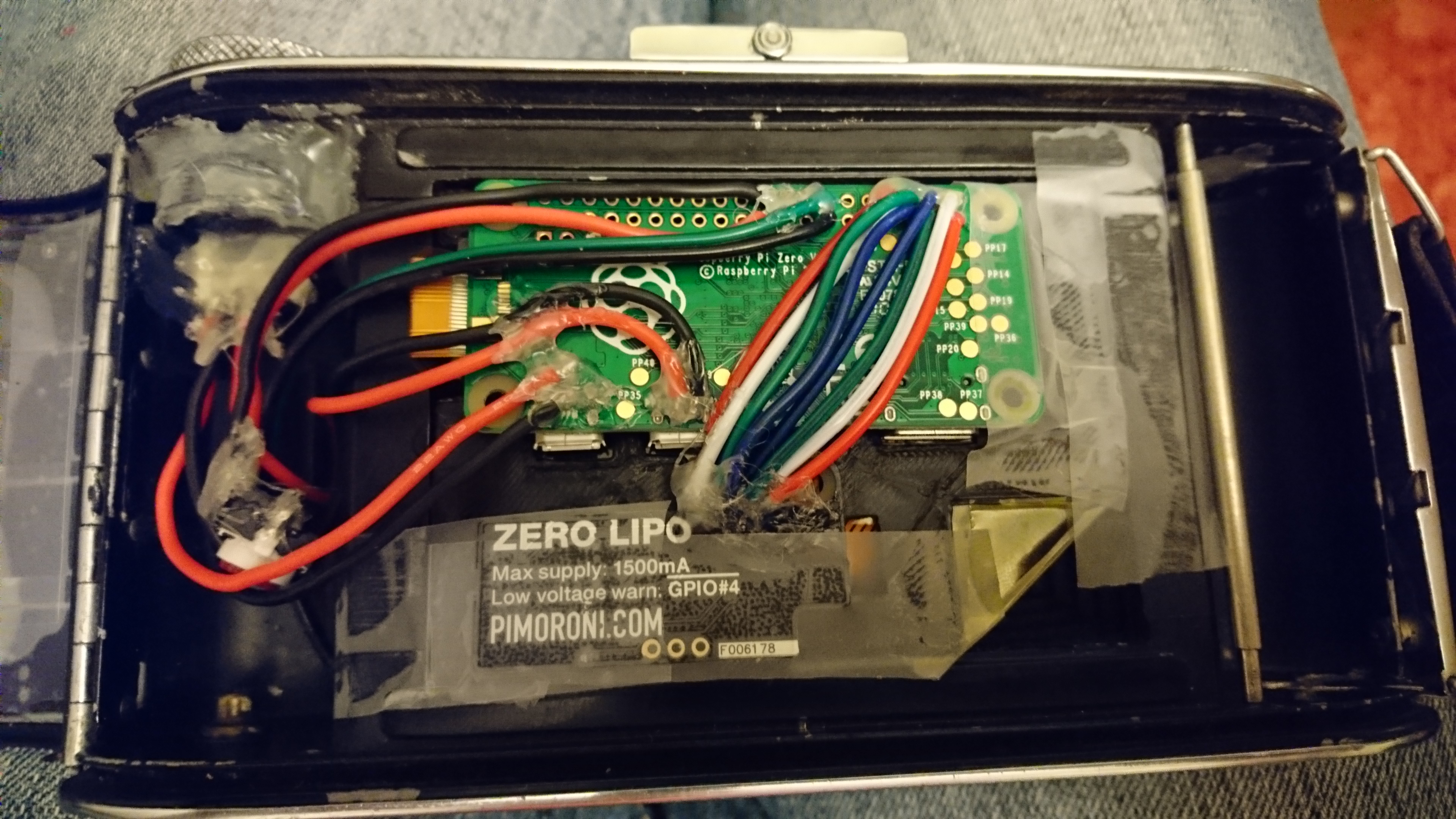 Now I had to decide how to hold the Pi Zero inside the camera. Simplest option was to mount it to a plate that would sit where the film normally would. I knocked up a prototype plate with cardboard and a craft knife. This meant I could easily test positioning the Pi Zero. Once finalised, this could be replicated in CAD and 3D printed for best strength vs material thickness. Once printed, I could wire up the battery controller to the Pi Zero and directly solder a female USB connector to the test pins on the back as there would be no room to use the micro USB connectors. The USB would be used as either a direct USB mass media storage option or my favourite option would be to plug in a wifi dongle and have the retro camera wifi enabled. In the future it could automatically upload photos to instagram or a dropbox / google drive.