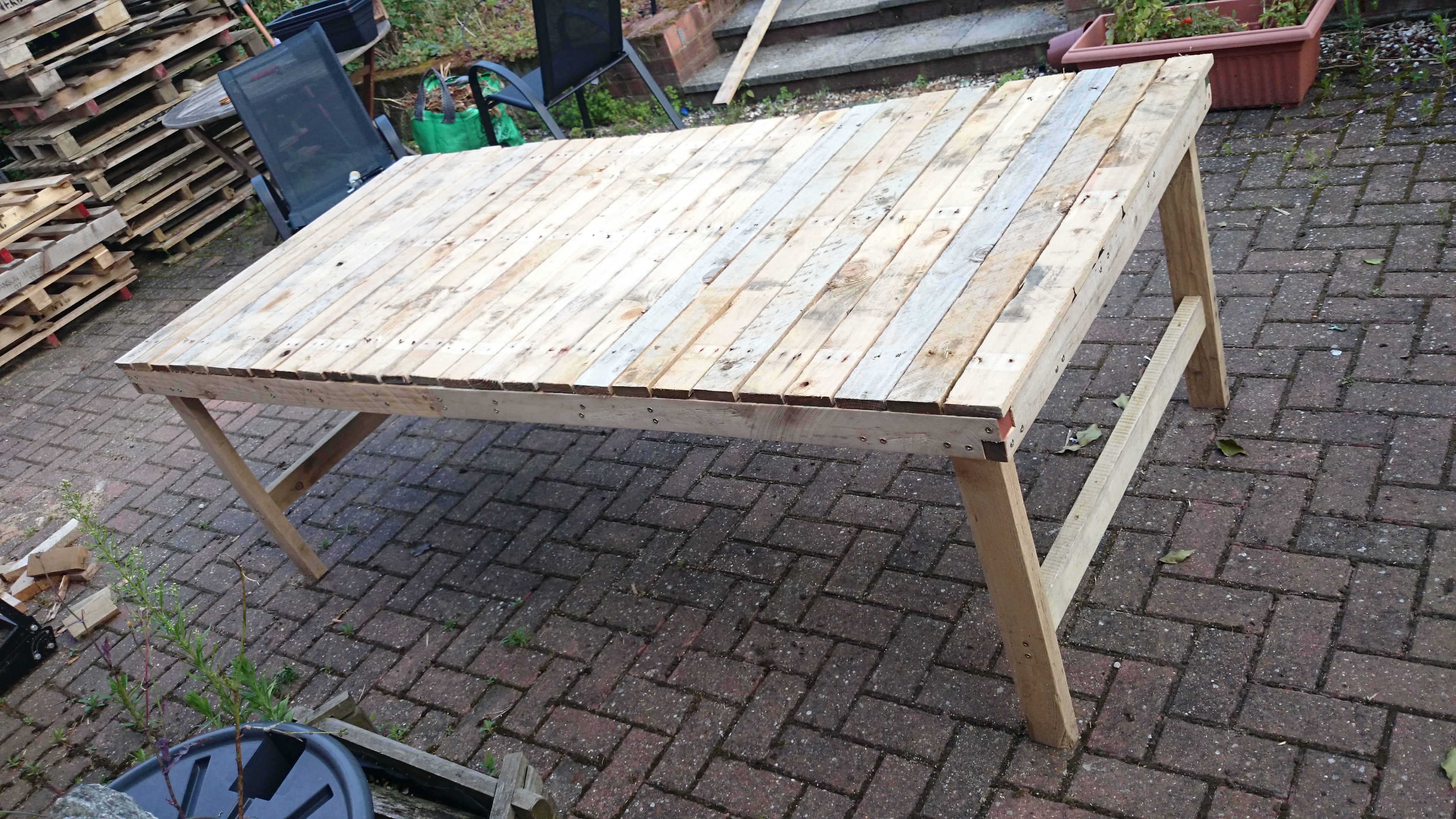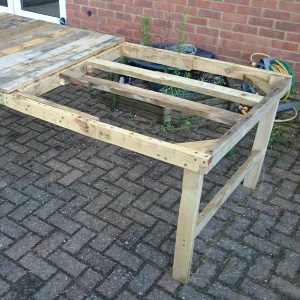 Pallets are usually made up from two plank types, several thin slat type planks on top with 3 thicker, more structural beams holding them together. Basically the width was determined by the length of the slats that were to be laid on top to use as the working surface. The height was determined by the length of the structural beams which handily was almost perfect standard table height. The table length was easily chosen as the length of two structural beams to give it a 2x1 rectangular shape.